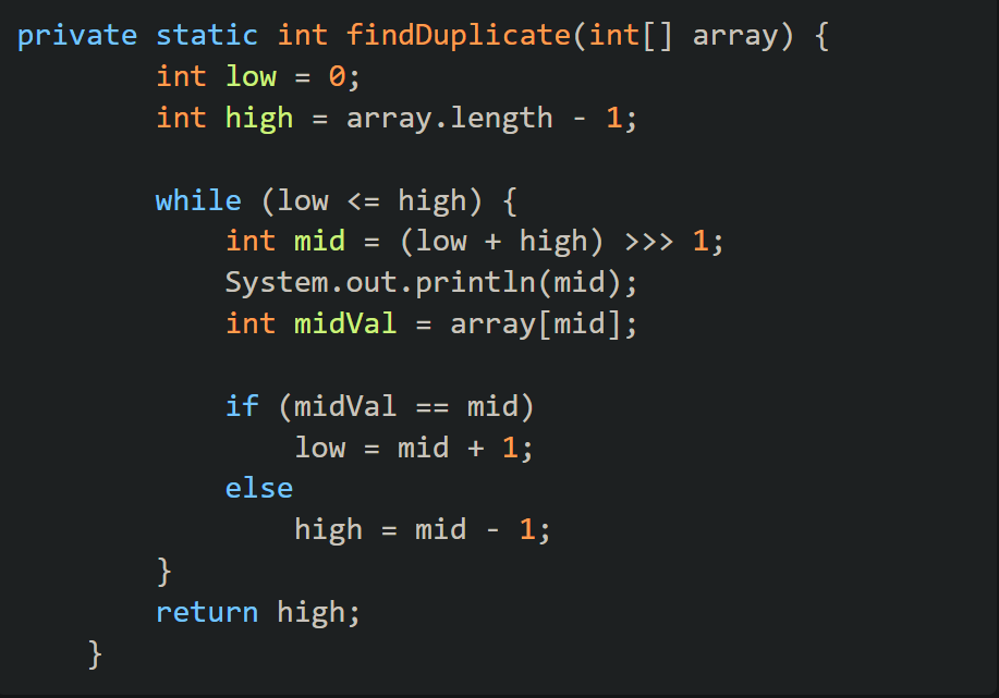 위의 int mid = (low + high) >>> 1은 low + (high - low) / 2 와 같은 의미를 가진다.