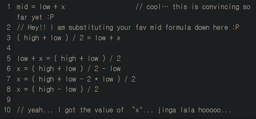 한 줄로 요약하자면 (high + low) / 2를 사용하면 overflow가 발생할 수 있으므로 low + (high - low) / 2와 같이 사용하여 항상 해당 값이 해당 자료형이 가질 수 있는 최대값보다 낮게 유지하는 것이다.