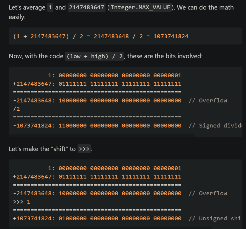 >>>와 >>의 차이를 알아보기 전에 low + (high - low) / 2와 (high + low) / 2의 차이를 먼저 알아야 한다.