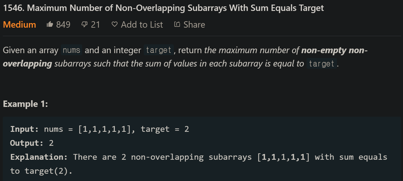 https://leetcode.com/problems/maximum-number-of-non-overlapping-subarrays-with-sum-equals-target/