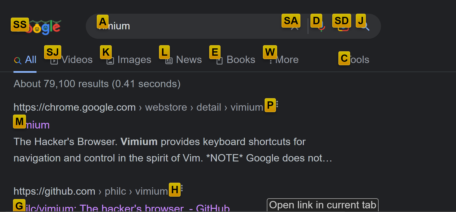 하지만 Vimium에겐 커다란 문제점이 있는데 웹표준을 제대로 지키지 않는 사이트에서 f 커맨드가 제대로 동작하지 않는다는 점이다.